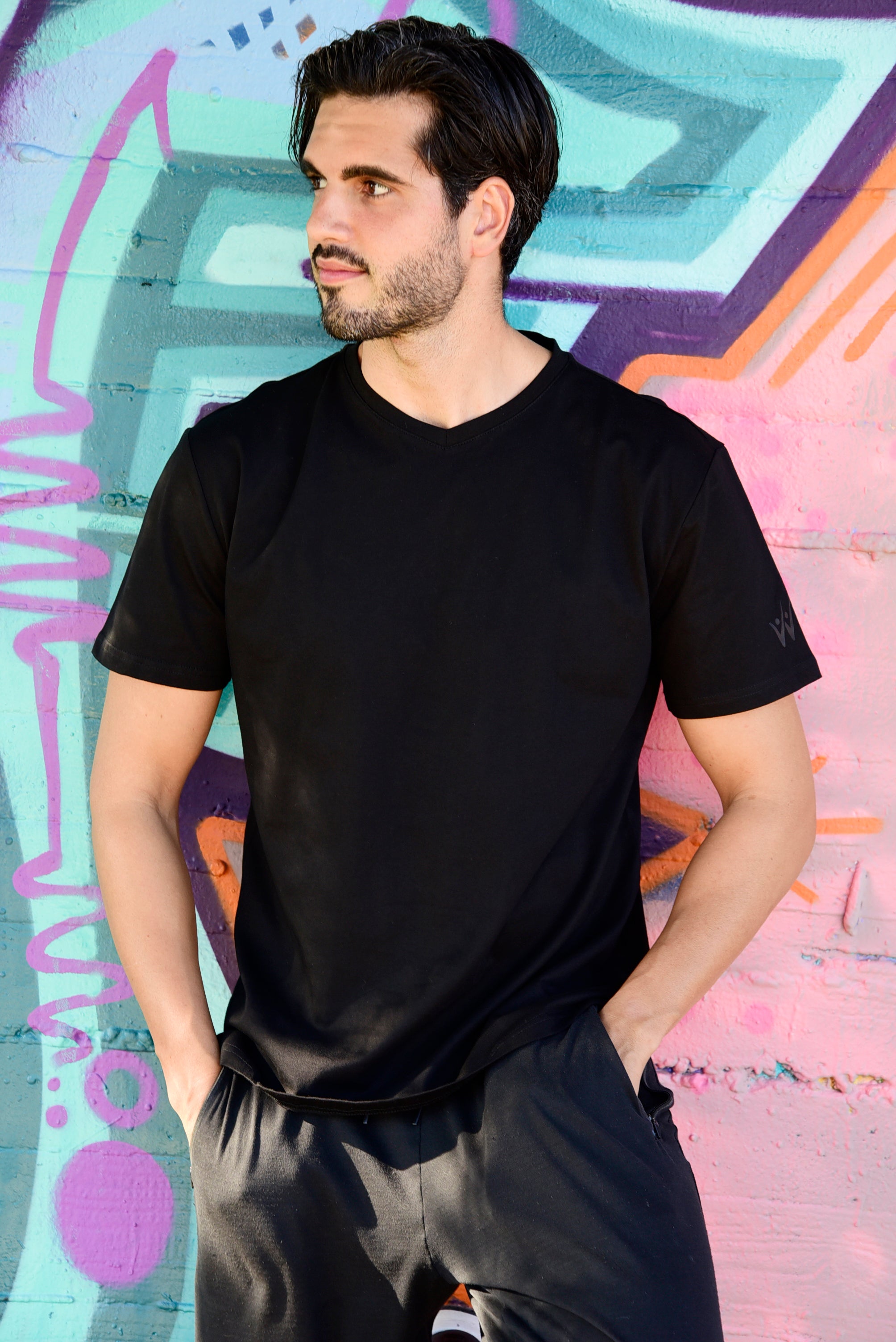 Schlicht und ausdrucksstark zugleich. Unser T-Shirt ist stylisch für unterwegs, im Büro, sowie auch zum Sport geeignet. Das Design ist zeitlos, männlich und attraktiv, ein Essential für jede Saison. In drei verschiedenen Farben erhältlich. Der Schnitt sitzt perfekt. Der Stoff ist äusserst angenehm auf der Haut zu tragen und wurde edel verarbeitet. Round V-Neck Ausschnitt - It's a gamechanger! WEAR FOR EVERYWHERE!